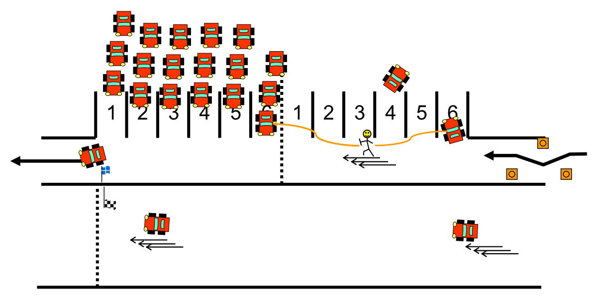 Nedan är en bild på start och målfållor för sex lag med fyra deltagare i varje. I bilden har lag nr 1 fått startflagg samtidigt som lag nr 6 håller på att byta från första förare till andra. Samtidigt är två lag ute och kör sina varv (detta har aldrig hänt samtidigt men en bild får räcka).
